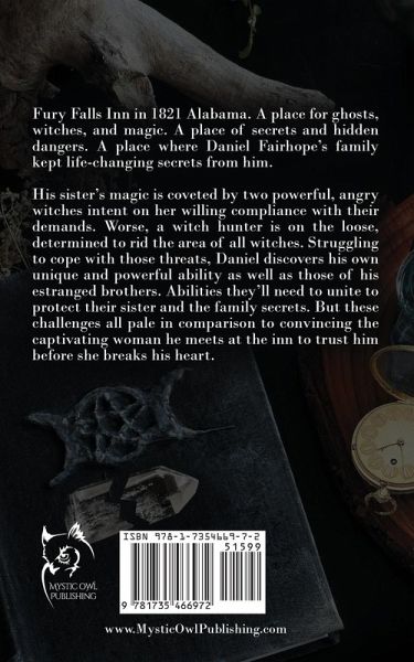 Fury Falls Inn in 1821 Alabama. A place for ghosts, witches, and magic. A place of secrets and hidden dangers. A place where Daniel Fairhope's family kept life-changing secrets from him. His sister's magic is coveted by two powerful, angry witches intent on her willing compliance with their demands. Worse, a witch hunter is on the loose, determined to rid the area of all witches. Struggling to cope with those threats, Daniel discovers his own unique and powerful ability as well as those of his estranged brothers. Abilities they'll need to unite to protect their sister and the family secrets. But these challenges all pale in comparison to convincing the captivating woman he meets at the inn to trust him before she breaks his heart.