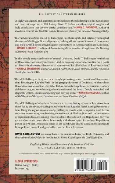 David T. Ballantyne's Fractured Freedoms is a riveting history of central Louisiana from the 1860s to the 1890s, focusing on majority-Black Rapides Parish during Reconstruction. Using the region as a case study, Ballantyne reveals what is, in part, a rural Reconstruction success story, emphasizing the resilience of Black politics and the persistence of significant divisions among white residents that allowed the Republican Party to gain and maintain power there. It was only with the collapse of state-level Republican power in 1877 that Democratic forces in the parish were able to dismantle local Republican political control and gradually constrict Black freedoms.