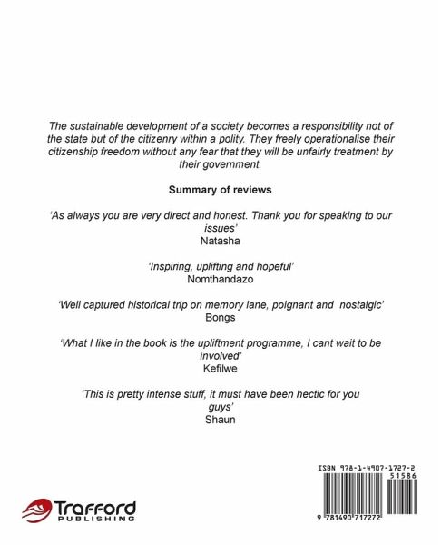 The sustainable development of a society becomes a responsibility not of the state but of the citizenry within a polity. They freely operationalise their citizenship freedom without any fear that they will be unfairly treatment by their government. Summary of reviews 'As always you are very direct and honest. Thank you for speaking to our issues' Natasha 'Inspiring, uplifting and hopeful', Nomthandazo 'Well captured historical trip on memory lane, poignant and nostalgic' Bongs 'What I like in the book is the upliftment programme, I cant wait to be involved' Kefilwe 'This is pretty intense stuff, it must have been hectic for you guys' Shaun