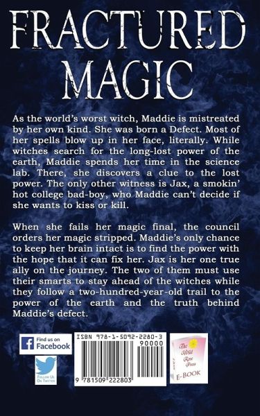 As the world's worst witch, Maddie is mistreated by her own kind. She was born a Defect. Most of her spells blow up in her face, literally. While witches search for the long-lost power of the earth, Maddie spends her time in the science lab. There, she discovers a clue to the lost power. The only other witness is Jax, a smokin' hot college bad-boy, who Maddie can't decide if she wants to kiss or kill. When she fails her magic final, the council orders her magic stripped. Maddie's only chance to keep her brain intact is to find the power with the hope that it can fix her. Jax is her one true ally on the journey. The two of them must use their smarts to stay ahead of the witches while they follow a two-hundred-year-old trail to the power of the earth and the truth behind Maddie's defect.