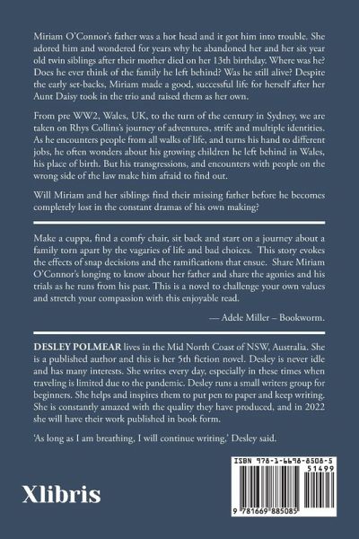 Miriam O'Connor's father was a hot head and it got him into trouble. She adored him and wondered for years why he abandoned her and her six year old twin siblings after their mother died on her 13th birthday. Where was he? Does he ever think of the family he left behind? Was he still alive? Despite the early set-backs, Miriam made a good, successful life for herself after her Aunt Daisy took in the trio and raised them as her own. From pre WW2, Wales, UK, to the turn of the century in Sydney, we are taken on Rhys Collins's journey of adventures, strife and multiple identities. As he encounters people from all walks of life, and turns his hand to different jobs, he often wonders about his growing children he left behind in Wales, his place of birth. But his transgressions, and encounters with people on the wrong side of the law make him afraid to find out. Will Miriam and her siblings find their missing father before he becomes completely lost in the constant dramas of his own making?