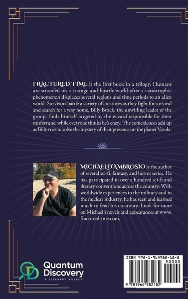 Fractured Time is the first book in a trilogy. Humans are stranded on a strange and hostile world after a catastrophic phenomenon displaces several regions and time periods to an alien world. Survivors battle a variety of creatures as they fight for survival and search for a way home. Billy Brock, the unwilling leader of the group, finds himself targeted by the wizard responsible for their misfortune, while everyone thinks he's crazy. The coincidences add up as Billy tries to solve the mystery of their presence on the planet Vesula. Michael D'Ambrosio is the author of several sci-fi, fantasy, and horror series. He has participated in over a hundred sci-fi and literary conventions across the country. With worldwide experiences in the military and in the nuclear industry, he has seen and learned much to feed his creativity. Look for more on Michael's novels and appearances at www.fracturedtime.com.