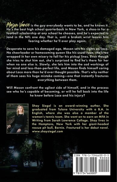 Mason Vance is the guy everybody wants to be, and he knows it. He's the best high school quarterback in New York, a shoo-in for a football scholarship at any school he chooses, and he's expected to land in the NFL one day. That is, until a broken wrist leaves him fearing whether he'll ever play again. Desperate to save his damaged ego, Mason sets his sights on Lace. No cheerleader or homecoming queen like his usual type, she's too wrapped in her own misery to fall for his pickup lines. Even though she tries to shut him out, she's surprised to find he's there for her when no one else is. Slowly, she lets him into the sad workings of her mind and less-than-perfect life, and Mason finds himself caring about Lace more than he'd ever thought possible. That's why neither of them sees his huge mistake coming-one that instantly fractures everything between them. Will Mason confront the ugliest side of himself, and in the process see who he's capable of becoming, or will he fall back into the life he knew before Lace and his injury? For contemporary young adult fiction fans comes a bold debut that is raw, relatable, and real. Fractured is a moving tribute to the fragility of human nature and its ability to destroy even the most powerful connections.