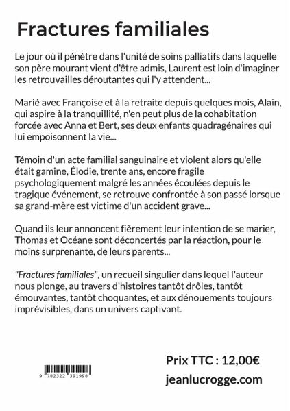 Le jour où il pénètre dans l'unité de soins palliatifs dans laquelle son père mourant vient d'être admis, Laurent est loin d'imaginer les retrouvailles déroutantes qui l'y attendent...Marié avec Françoise et à la retraite depuis quelques mois, Alain, qui aspire à la tranquillité, n'en peut plus de la cohabitation forcée avec Anna et Bert, ses deux enfants quadragénaires qui lui empoisonnent la vie...Témoin d'un acte familial sanguinaire et violent alors qu'elle était gamine, Élodie, trente ans, encore fragile psychologiquement malgré les années écoulées depuis le tragique événement, se retrouve confrontée à son passé lorsque sa grand-mère est victime d'un accident grave...Quand ils leur annoncent fièrement leur intention de se marier, Thomas et Océane sont déconcertés par la réaction, pour le moins surprenante, de leurs parents..."Fractures familiales", un recueil de nouvelles dans lequel l'auteur nous plonge, au travers d'histoires tantôt drôles, tantôt émouvantes, tantôt choquantes, et aux dénouements toujours imprévisibles, dans un univers singulier et captivant.