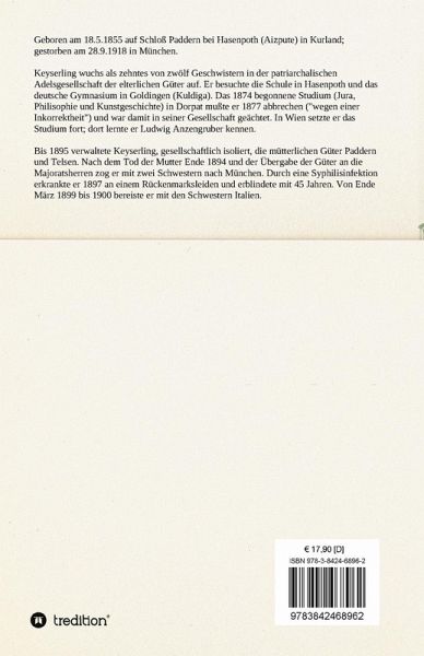 Geboren am 18.5.1855 auf Schloß Paddern bei Hasenpoth (Aizpute) in Kurland; gestorben am 28.9.1918 in München. Keyserling wuchs als zehntes von zwölf Geschwistern in der patriarchalischen Adelsgesellschaft der elterlichen Güter auf. Er besuchte die Schule in Hasenpoth und das deutsche Gymnasium in Goldingen (Kuldiga). Das 1874 begonnene Studium (Jura, Philisophie und Kunstgeschichte) in Dorpat mußte er 1877 abbrechen ("wegen einer Inkorrektheit") und war damit in seiner Gesellschaft geächtet. In Wien setzte er das Studium fort; dort lernte erLudwig Anzengruberkennen. Bis 1895 verwaltete Keyserling, gesellschaftlich isoliert, die mütterlichen Güter Paddern und Telsen. Nach dem Tod der Mutter Ende 1894 und der Übergabe der Güter an die Majoratsherren zog er mit zwei Schwestern nach München. Durch eine Syphilisinfektion erkrankte er 1897 an einem Rückenmarksleiden und erblindete mit 45 Jahren. Von Ende März 1899 bis 1900 bereiste er mit den Schwestern Italien.