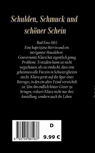 Bad Ems 1863.Klara arbeitet weiterhin als Gouvernante für die Bankiersfamilie Rotherbruch, aber die Bedingungen werden immer schwieriger. Ihre Herrin ist launisch und der neue Hauslehrer schikaniert sie. Ein mysteriöser Zettel bringt sie auf die Spur der Intrige um eine russische Fürstin, die in Bad Ems weilt. Eine Täuschung, die ursprünglich erdacht wurde, damit alle Beteiligten ihr Gesicht wahren können, wird von einem falschen Haushofmeister für ein groß angelegtes Verbrechen ausgenutzt. Klara entdeckt, dass auch der Betrüger, der einst den Tod ihres Vaters und den Ruin ihrer Familie verschuldete, in den Fall verwickelt ist. Als es an ihr liegt, das Vermögen einer Freundin zu retten, zögert sie nicht lange und riskiert dabei Anstellung und Leben.