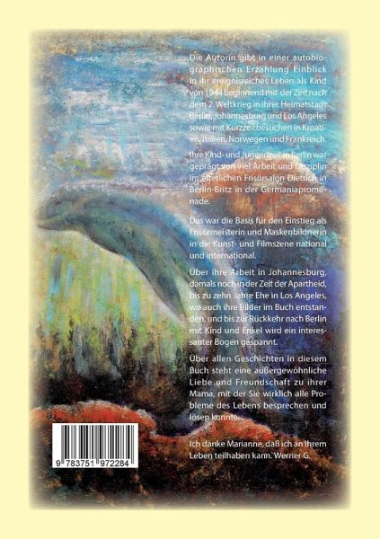 Die Autorin gibt in einer autobiographischen Erzählung Einblick in ihr ereignisreiches Leben als Kind von 1944 beginnend mit der Zeit nach dem 2.Weltkrieg in ihrer Heimatstadt Berlin, Johannesburg und Los Angeles sowie mit Kurzzeitbesuchen in Kroatien, Norwegen und Frankreich. Ihre Kind- und Jugendzeit in Berlin war geprägt von viel Arbeit und Disziplin im elterlichen Frisörsalon in der Germaniapromenade.Das war die Basis für den Einstieg als Frisörmeisterin und Maskenbildnerin in die Kunst- und Filmszene national und international.Über ihre Arbeit in Johannesburg, damals noch in der Zeit der Apartheid, bis zu zehn Jahren Ehe in Los Angeles, wo auch ihre Bilder im Buch entstanden, und bis zur Rückkehr nach Berlin mit Kind und Enkel wird ein interessanter Bogen gespannt.Über allen Geschichten in diesem Buch steht eine außergewöhnliche Liebe und Freundschaft zu ihrer Mama, mit der sie wirklich alle Probleme des Lebens besprechen und lösen konnte.Ich danke Marianne, daß ich an ihremLeben teilhaben kann. Werner G.