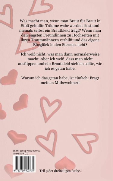 Was macht man, wenn man Braut für Braut in Stoff gehüllte Träume wahr werden lässt und niemals selbst ein Brautkleid trägt? Wenn man den engsten Freundinnen zu Hochzeiten mit ihren Traummännern verhilft und das eigene Eheglück in den Sternen steht?Ich weiß nicht, was man dann normalerweise macht. Aber ich weiß, dass man nicht ausflippen und ein Brautkleid stehlen sollte, wie ich es getan habe.Warum ich das getan habe, ist einfach: Fragt meinen Mitbewohner!