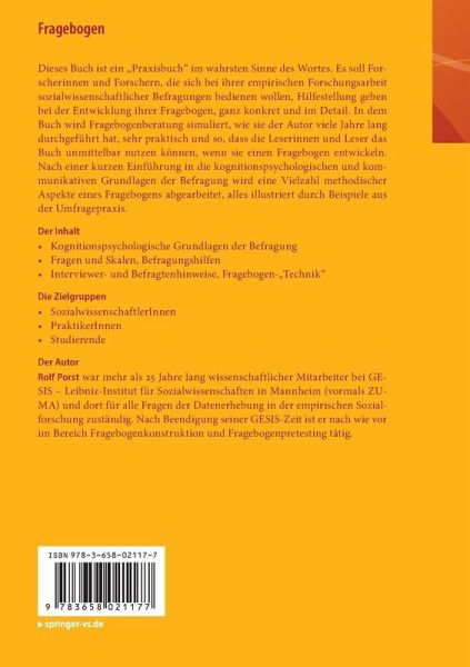 Dieses Buch ist ein "Praxisbuch" im wahrsten Sinne des Wortes. Es soll Forscherinnen und Forschern, die sich bei ihrer empirischen Forschungsarbeit sozialwissenschaftlicher Befragungen bedienen wollen, Hilfestellung geben bei der Entwicklung ihrer Fragebogen, ganz konkret und im Detail. In dem Buch wird Fragebogenberatung simuliert, wie sie der Autor viele Jahre lang durchgeführt hat, sehr praktisch und so, dass die Leserinnen und Leser das Buch unmittelbar nutzen können, wenn sie einen Fragebogen entwickeln. Nach einer kurzen Einführung in die kognitionspsychologischen und kommunikativen Grundlagen der Befragung wird eine Vielzahl methodischer Aspekte eines Fragebogens abgearbeitet, alles illustriert durch Beispiele aus der Umfragepraxis.