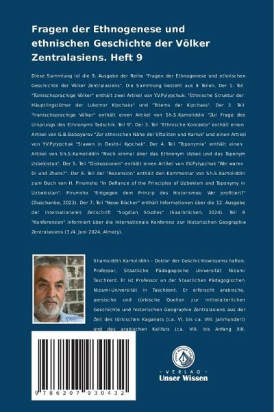 Diese Sammlung ist die 9. Ausgabe der Reihe "Fragen der Ethnogenese und ethnischen Geschichte der Völker Zentralasiens". Die Sammlung besteht aus 8 Teilen. Der 1. Teil "Türkischsprachige Völker" enthält zwei Artikel von Y.V.Pylypchuk: "Ethnische Struktur der Häuptlingstümer der Lukomor Kipchaks" und "Totems der Kipchaks". Der 2. Teil "Iranischsprachige Völker" enthält einen Artikel von Sh.S.Kamoliddin "Zur Frage des Ursprungs des Ethnonyms Tadschik. Teil 9". Der 3. Teil "Ethnische Kontakte" enthält einen Artikel von G.B.Babayarov "Zur ethnischen Nähe der Eftaliten und Karluk" und einen Artikel von Y.V.Pylypchuk "Slawen in Desht-i Kypchak". Der 4. Teil "Toponymie" enthält einen Artikel von Sh.S.Kamoliddin "Noch einmal über das Ethnonym Usbek und das Toponym Usbekistan". Der 5. Teil "Diskussionen" enthält einen Artikel von Y.V.Pylypchuk "Wer waren Di und Zhuns?". Der 6. Teil der "Rezension" enthält den Kommentar von Sh.S.Kamoliddin zum Buch von H. Pirumsho "In Defiance of the Principles of Uzbekism and Toponymy in Uzbekistan". Pirumsho "Entgegen dem Prinzip des Historismus: Wer profitiert?" (Duschanbe, 2023). Der 7. Teil "Neue Bücher" enthält Informationen über die 12. Ausgabe der internationalen Zeitschrift "Sogdian Studies" (Saarbrücken, 2024). Teil 8 "Konferenzen" informiert über die Internationale Konferenz zur Historischen Geographie Zentralasiens (3./4. Juni 2024, Almaty).