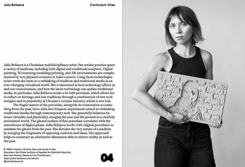 Die ukrainische Künstlerin Julia Beliaeva (geb. 1988 in Haisyn, Ukraine)) trat unmittelbar nach dem Ausbruch des russischen Angriffskrieges auf die Ukraine eine Residency in der Academy of Ceramics Gmunden in Österreich an. In ihren digital generierten Skulpturen und Videoarbeiten verschmilzt Beliaeva Vergangenheit und Gegenwart zu einer Erkundung der Ereignisse. Das Material Porzellan gibt ihr die Möglichkeit, über das Erbe und die verlorenen Traditionen ihrer Heimat nachzudenken, indem sie neue Technologien mit der einstigen Popularität der ukrainischen Keramikindustrie kombiniert. Ihre neuen kreierten Werke wurden während ihres Aufenthalts in Österreich von der Gmundner Manufaktur in Keramik geformt.