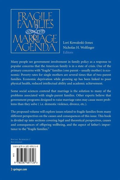 The proposed volume will explore issues related to fragile families from many different perspectives on the causes and consequences of this issue. This book is divided up into sections covering legal and theoretical perspectives, causes and consequences of offspring wellbeing, and the aspect of father's importance to the "fragile families".