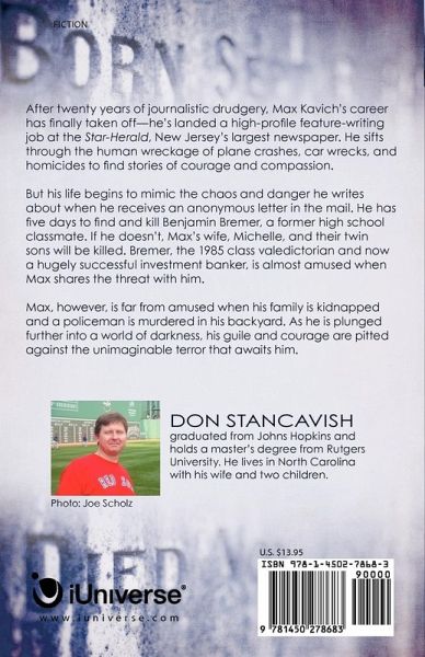 After twenty years of journalistic drudgery, Max Kavich's career has finally taken off-he's landed a high-profile feature-writing job at the Star-Herald, New Jersey's largest newspaper. He sifts through the human wreckage of plane crashes, car wrecks, and homicides to find stories of courage and compassion. But his life begins to mimic the chaos and danger he writes about when he receives an anonymous letter in the mail. He has five days to find and kill Benjamin Bremer, a former high school classmate. If he doesn't, Max's wife, Michelle, and their twin sons will be killed. Bremer, the 1985 class valedictorian and now a hugely successful investment banker, is almost amused when Max shares the threat with him. Max, however, is far from amused when his family is kidnapped and a policeman is murdered in his backyard. As he is plunged further into a world of darkness, his guile and courage are pitted against the unimaginable terror that awaits him.