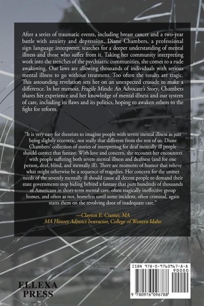 After a series of traumatic events, including breast cancer and a two-year battle with anxiety and depression, Diane Chambers, a professional sign language interpreter, searches for a deeper understanding of mental illness and those who suffer from it. Taking her interpreting work into the trenches of the psychiatric communities, she comes to a rude awakening. Our laws are allowing thousands of individuals with serious mental illness to go without treatment. Too often the results are tragic. This astounding revelation sets her on an unexpected crusade to make a difference. In her memoir, Fragile Minds: An Advocate's Story, Chambers shares her experience and knowledge of mental illness and our system of care, including its flaws and politics, hoping to awaken others to the fight for reform of our laws.