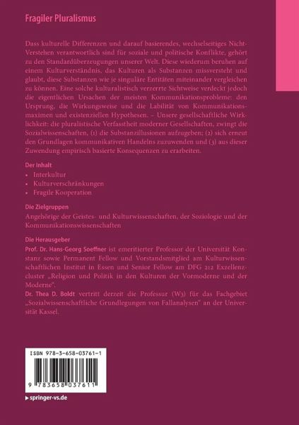 Dass kulturelle Differenzen und darauf basierendes, wechselseitiges Nicht- Verstehen verantwortlich sind für soziale und politische Konflikte, gehört zu den Standardüberzeugungen unserer Welt. Diese wiederum beruhen auf einem Kulturverständnis, das Kulturen als Substanzen missversteht und glaubt, diese Substanzen wie je singuläre Entitäten miteinander vergleichen zu können. Eine solche kulturalistisch verzerrte Sichtweise verdeckt jedoch die eigentlichen Ursachen der meisten Kommunikationsprobleme: den Ursprung, die Wirkungsweise und die Labilität von Kommunikationsmaximen und existenziellen Hypothesen. - Unsere gesellschaftliche Wirklichkeit: die pluralistische Verfasstheit moderner Gesellschaften, zwingt die Sozialwissenschaften, (1) die Substanzillusionen aufzugeben; (2) sich erneut den Grundlagen kommunikativen Handelns zuzuwenden und (3) aus dieser Zuwendung empirisch basierte Konsequenzen zu erarbeiten.