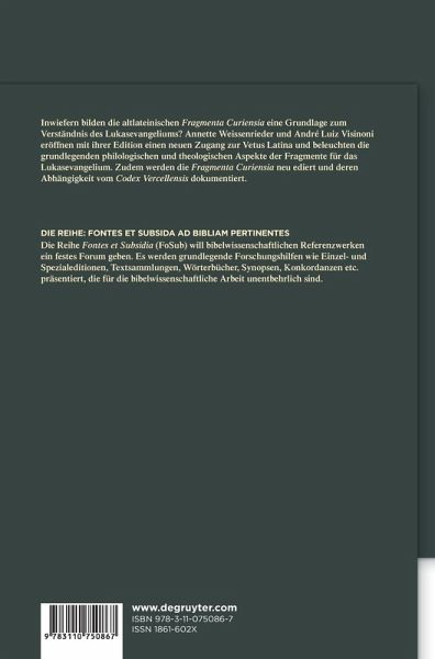 Inwiefern bilden die altlateinischen Fragmenta Curiensia eine Grundlage zum Verständnis des Lukasevangeliums? Annette Weissenrieder und André Luiz Visinoni eröffnen mit ihrer Edition der in das 4. Jahrhundert zu datierenden Fragmenta Curiensia einen neuen Zugang zur Vetus Latina, indem sie die grundlegenden philologischen und theologischen Aspekte der Fragmente für das Lukasevangeliums beleuchten. Zudem werden die Fragmenta Curiensia, die eines der ältesten Zeugen des Lukasevangeliums in lateinischer Sprache darstellen, neu ediert wie auch deren Abhängigkeit vom Codex Vercellensis sorgfältig dokumentiert.