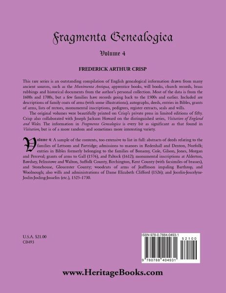 This rare series is an outstanding compilation of English genealogical information drawn from many ancient sources, such as the Munimenta Antiqua, apprentice books, will books, church records, brass rubbings and historical documents from the author's personal collection. Most of the data is from the 1600s and 1700s, but a few families have records going back to the 1500s and earlier. Included are descriptions of family coats of arms (with some illustrations), autographs, deeds, entries in Bibles, grants of arms, lists of rectors, monumental inscriptions, pedigrees, register extracts, seals and wills. The original volumes were beautifully printed on Crisp's private press in limited editions of fifty. Crisp also collaborated with Joseph Jackson Howard on the distinguished series, Visitation of England and Wales. The information in Fragmenta Genealogica is every bit as significant as that found in Visitation, but is of a more random and sometimes more interesting variety. A sample of the contents, too extensive to list in full: abstracts of deeds relating to the families of Lettsom and Partridge; admissions to manors in Redenhall and Denton, Norfolk; entries in Bibles formerly belonging to the families of Bonamy, Cole, Gilson, Jones, Morgan and Perceval; grants of arms to Gall (1576), and Paltock (1612); monumental inscriptions at Alderton, Bawdsey, Felixstowe and Walton, Suffolk County, Birchington, Kent County (with facsimiles of brasses), and Stonehouse, Gloucester County; woodcuts of arms of Jeaffreson impaling Barthrop, and Woolnough; also wills and administrations of Dame Elizabeth Clifford (1526); and Jocelin-Joscelyne-Joslin-Josling-Josselin (etc.), 1525-1730.