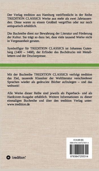 Diese Hardcover-Ausgabe ist Teil der TREDITION CLASSICS. Der Verlag tredition aus Hamburg veröffentlicht in der Buchreihe TREDITION CLASSICS Werke aus mehr als zwei Jahrtausenden. Diese waren zu einem Großteil vergriffen oder nur noch antiquarisch erhältlich. Mit TREDITION CLASSICS verfolgt tredition das Ziel, tausende Klassiker der Weltliteratur verschiedener Sprachen wieder als gedruckte Bücher zu verlegen und das weltweit! Die Buchreihe dient zur Bewahrung der Literatur und Förderung der Kultur. Sie trägt so dazu bei, dass viele tausend Werke nicht in Vergessenheit geraten.