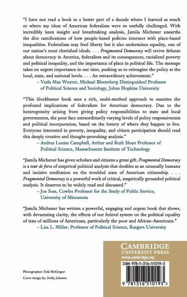 Medicaid is the single largest public health insurer in the United States, covering upwards of 70 million Americans. Crucially, Medicaid is also an intergovernmental program that yokes poverty to federalism: the federal government determines its broad contours, while states have tremendous discretion over how Medicaid is designed and implemented. Where some locales are generous and open handed, others are tight-fisted and punitive. In Fragmented Democracy, Jamila Michener demonstrates the consequences of such disparities for democratic citizenship. Unpacking how federalism transforms Medicaid beneficiaries' interpretations of government and structures their participation in politics, the book examines American democracy from the vantage point(s) of those who are living in or near poverty, (disproportionately) Black or Latino, and reliant on a federated government for vital resources.