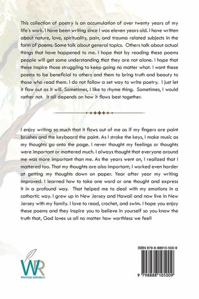 It is the accumulation of over 20 years of my life's work of poetry that I have written since I was eleven years old. I have written about nature, love, spirituality, pain, and trauma related subjects in the form of poems. Some talk about general topics but others talk about actual things that have happened to me. I hope that by reading these poems people will get some understanding that they are not alone. I hope that these inspire them to keep going no matter what. I want these poems to be beneficial to others and I want them to bring truth and beauty to those who read them. I do not follow a set way to write poetry I just let it flow out as it will. Sometimes I like to rhyme things sometimes I would rather not, it all depends on how it flows best together.