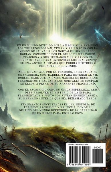 En un mundo dividido por la magia y la ambición, los trillizos Dorian, Vivian y Aris nacen con la misión de salvar a los mortales. Sin embargo, Dorian, consumido por el deseo de más poder, traiciona a sus hermanos y se alía con el demonio Gaser para encontrar los fragmentos de una antigua espada que podría destruir o reconstruir su mundo.Aris, devastado por la traición, se embarca en una carrera contrarreloj para detener al vil Dorian. Sabe que la única manera de reunir los fragmentos y salvar a los mortales es confiar en ellos, a pesar de su aparente fragilidad. Con el sacrificio como su única esperanza, Aris debe resolver el misterio de la espada fragmentada y junto con Vivian enfrentarse a su hermano antes de que sea demasiado tarde. Fragmentos ancestrales es una historia de traición, sacrificio y valentía, donde el destino del mundo dependerá de la capacidad de un héroe para unir lo roto.