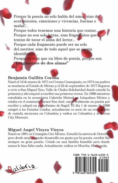 Porque la poesía no solo habla del amor, sino de sentimientos, emociones y vivencias, buenas o malas... Porque todos tenemos una historia que contar... Porque no son solo letras, sino fragmentos que tratan de tocar el alma del lector... Porque cada fragmento puede ser no solo del escritor, sino de todo aquel que se sienta identificado... Porque es mas que un libro de poesía, porque son ''Fragmentos de dos almas*