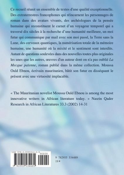 Ce recueil réunit un ensemble de textes d'une qualité exceptionnelle. Des extraterrestres francophones qui réincarnent les personnages de roman dans des avatars vivants. Des archéologues de la pensée humaine qui reconstituent le carnet d'un voyageur temporel qui a traversé dix siècles à la recherche d'une humanité meilleure. Un moi futur qui communique par mail avec son moi passé. La Terre sans la Lune. Des cerveaux quantiques. La numérisation totale de la mémoire humaine. Une humanité où la mixité et le sentiment sont interdits. Autant de questions soulevées dans des nouvelles toutes plus originales les unes que les autres. L'¿uvre d'un auteur dont on n'a pas oublié La Mecque païenne, roman publié dans la même collection. Moussa Ould Ebnou, écrivain mauritanien, bâtit son futur en disséquant le présent avec une virtuosité implacable.
