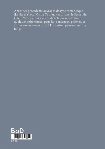 Après ses précédents ouvrages de type romanesque (Récits d'Yves, l'Os du Toufoulkanthrope, le Secret du Chef), Yves Lafont a réuni dans le présent volume quelques aphorismes, pensées, sentences, poèmes, et autres textes courts, qui, à l'occasion, peuvent en dire long...