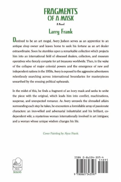 Destined to be an art mogul, Avery Judson serves as an apprentice to an antique shop owner and leaves home to seek his fortune as an art dealer extraordinaire. Soon he stumbles upon a remarkable collection which projects him into an international field of obsessed dealers, collectors, and museum operatives who fiercely compete for art treasures worldwide. Then, in the wake of the collapse of major colonial powers and the emergence of new and independent nations in the 1950s, Avery is exposed to the aggressive adventurers relentlessly searching across international boundaries for masterpieces unearthed by the ensuing political upheavals. In the midst of this, he finds a fragment of an ivory mask and seeks to unite the piece with the original, which leads him into conflict, machinations, suspense, and unexpected romance. As Avery unravels the shrouded affairs surrounding each step he takes, he encounters a formidable array of passionate characters: an iron-willed and adversarial industrialist and his brilliant, co-dependent wife; a mysterious woman internationally involved in art intrigues; and a woman whose unique wisdom changes his life.