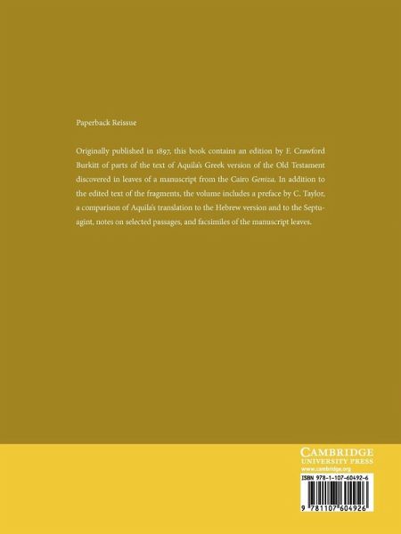 Originally published in 1897, this book contains an edition by F. Crawford Burkitt of parts of the text of Aquila's Greek version of the Old Testament discovered in leaves of a manuscript from the Cairo Geniza. In addition to the edited text of the fragments, the volume includes a preface by C. Taylor, a comparison of Aquila's translation to the Hebrew version and to the Septuagint, notes on selected passages, and facsimiles of the manuscript leaves.