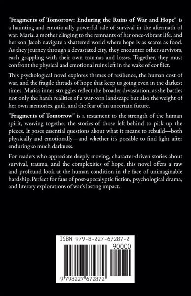 "Fragments of Tomorrow: Enduring the Ruins of War and Hope" is a haunting and emotionally powerful tale of survival in the aftermath of war. Maria, a mother clinging to the remnants of her once-vibrant life, and her son Jacob navigate a shattered world where hope is as scarce as food. As they journey through a devastated city, they encounter other survivors, each grappling with their own traumas and losses. Together, they must confront the physical and emotional ruins left in the wake of conflict. This psychological novel explores themes of resilience, the human cost of war, and the fragile threads of hope that keep us going even in the darkest times. Maria's inner struggles reflect the broader devastation, as she battles not only the harsh realities of a war-torn landscape but also the weight of her own memories, guilt, and the fear of an uncertain future. "Fragments of Tomorrow" is a testament to the strength of the human spirit, weaving together the stories of those left behind to pick up the pieces. It poses essential questions about what it means to rebuild-both physically and emotionally-and whether it's possible to find light after enduring so much darkness. For readers who appreciate deeply moving, character-driven stories about survival, trauma, and the complexities of hope, this novel offers a raw and profound look at the human condition in the face of unimaginable hardship. Perfect for fans of post-apocalyptic fiction, psychological drama, and literary explorations of war's lasting impact.