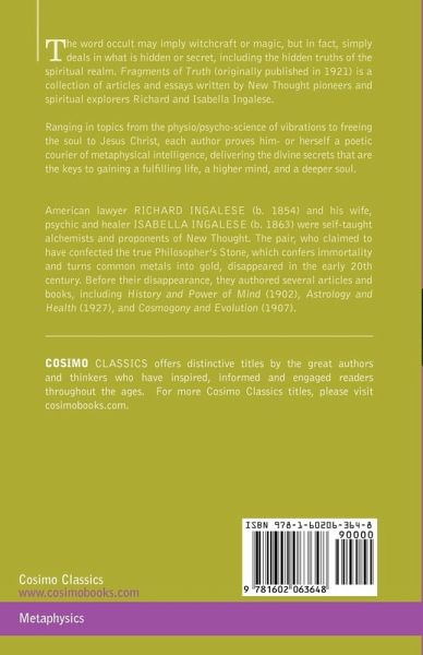 The word occult may imply witchcraft or magic, but in fact, simply deals in what is hidden or secret, including the hidden truths of the spiritual realm. Fragments of Truth (originally published in 1921) is a collection of articles and essays written by New Thought pioneers and spiritual explorers Richard and Isabella Ingalese. Ranging in topics from the physio/psycho-science of vibrations to freeing the soul to Jesus Christ, each author proves him- or herself a poetic courier of metaphysical intelligence, delivering the divine secrets that are the keys to gaining a fulfilling life, a higher mind, and a deeper soul. American lawyer RICHARD INGALESE (b. 1854) and his wife, psychic and healer ISABELLA INGALESE (b. 1863) were self-taught alchemists and proponents of New Thought. The pair, who claimed to have confected the true Philosopher's Stone, which confers immortality and turns common metals into gold, disappeared in the early 20th century. Before their disappearance, they authored several articles and books, including History and Power of Mind (1902), Astrology and Health (1927), and Cosmogony and Evolution (1907).