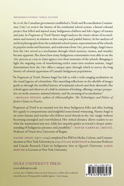 In 2008, the Canadian government established a Truth and Reconciliation Commission (TRC) to review the history of the residential school system, a brutal colonial project that killed and injured many Indigenous children and left a legacy of trauma and pain. In Fragments of Truth Naomi Angel analyzes the visual culture of reconciliation and memory in relation to this complex and painful history. In her analyses of archival photographs from the residential school system, representations of the schools in popular media and literature, and testimonies from TRC proceedings, Angel traces how the TRC served as a mechanism through which memory, trauma, and visuality became apparent. She shows how many Indigenous communities were able to use the TRC process as a way to claim agency over their memories of the schools. Bringing to light the ongoing costs of transforming settler states into modern nations, Angel demonstrates how the TRC offers a unique optic through which to survey the long history of colonial oppression of Canada's Indigenous populations.