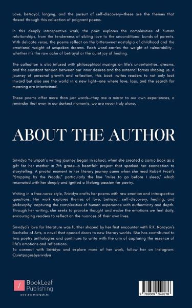 Srividya Yeluripati's writing journey began in school, when she created a comic book as a gift for her mother in 7th grade-a heartfelt project that sparked her connection to storytelling. A pivotal moment in her literary journey came when she read Robert Frost's "Stopping by the Woods," particularly the line "miles to go before I sleep," which resonated with her deeply and ignited a lifelong passion for poetry. Writing in a free-verse style, Srividya crafts her poems with raw emotion and introspective questions. Her work explores themes of love, betrayal, self-discovery, healing, and philosophy, capturing the complexities of human experience with authenticity and depth. Through her writing, she seeks to provoke thought and evoke the emotions we feel daily, encouraging readers to reflect on the nuances of their own lives. Srividya's love for literature was further shaped by her first encounter with R.K. Narayan's Bachelor of Arts, a novel that opened doors to new literary worlds. She has contributed to two poetry anthologies and continues to write with the aim of capturing the essence of life's emotions and reflections. To connect with Srividya and explore more of her work, follow her on Instagram: Quietpagesbysrividya
