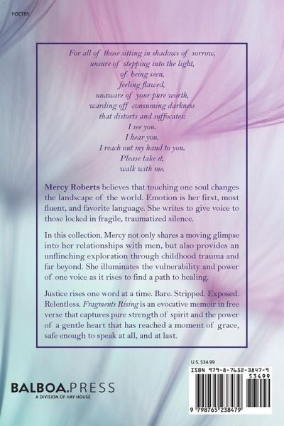 For all of those sitting in shadows of sorrow, unsure of stepping into the light, of being seen, feeling flawed, unaware of your pure worth, warding off consuming darkness that distorts and suffocates: I see you. I hear you. I reach out my hand to you. Please take it, walk with me. Mercy Roberts believes that touching one soul changes the landscape of the world. Emotion is her first, most fluent, and favorite language. She writes to give voice to those locked in fragile, traumatized silence. In this collection of free verse, Mercy not only shares a moving glimpse into her relationships with men, but also provides an unflinching exploration through childhood trauma and far beyond. She illuminates the vulnerability and power of one voice as it rises to find a path to healing. Justice rises one word at a time. Bare. Stripped. Exposed. Relentless. Fragments Rising is an evocative memoir in free verse that captures pure strength of spirit and the power of a gentle heart that has reached a moment of grace, safe enough to speak at all, and at last.