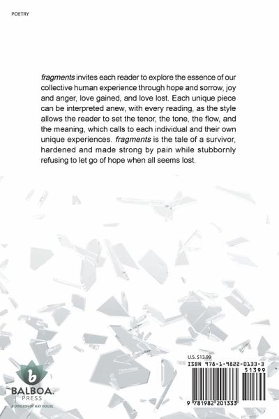 fragments invites each reader to explore the essence of our collective human experience through hope and sorrow, joy and anger, love gained, and love lost. Each unique piece can be interpreted anew, with every reading, as the style allows the reader to set the tenor, the tone, the flow, and the meaning, which calls to each individual and their own unique experiences. fragments is the tale of a survivor, hardened and made strong by pain while stubbornly refusing to let go of hope when all seems lost.