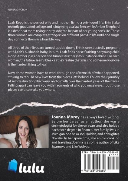Leah Reed is the perfect wife and mother, living a privileged life. Erin Blake recently graduated college and is interning at a law firm, while Amber Shephard is a deadbeat mom trying to stay sober to be part of her young son's life. These three women are complete strangers on different paths in life until one single day connects them in a horrible way. All three of their lives are turned upside down. Erin is unexpectedly pregnant with Leah's husband's baby. In turn, Leah finds herself raising her young child alone. Amber tumbles further into substance abuse. For each woman, the future seems bleak as they realize that missing someone you love is the hardest thing to heal. These women have to work through the aftermath of what happened, striving to rebuild new lives from the pieces left behind. Their journey of self-destruction, discovery, and growth over the hardest years of their lives. Falling apart can leave you with fragments of who you once were...but those pieces can also make you whole.