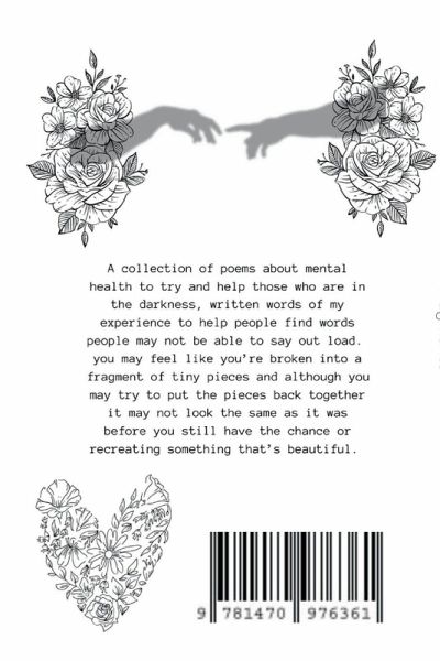 This is a third poetry book I have written, They're all based on mental health, based on my experience from my own mind and written from the heart I can't promise perfection but I can promise I mean every word I say in the book. Not only do I hope to provide awareness and understanding I hope to give hope. It's raw it's real, it's the truth of what it's like to struggle with mental health but it's also to show that you're not the pain you're experiencing. Hopefully to those reading they will realise they're not alone and there is someone out there who does understand maybe my words won't be that powerful, but what is powerful is empathy and kindness compassion and validation and I can promise this book has all those things or at least I tried to. in a world that's full of darkness I hope to provide a little light with this book. We can all feel fragmented at times but that doesn't mean we can't make something new something that's beautiful and meaningful with the broken pieces. I hope this book could be the voice for those struggling to find the words themselves. I hope the reader knows the world would not be better with them being gone and there's more to them then their mental illness, in a society that may not understand or maybe even the people we love or care about don't understand I hope this book will be someone's escape.