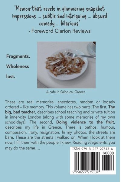 "Memoir that revels in glimmering snapshot impressions ... subtle and intriguing ... absurd comedy ... hilarious" Foreword Clarion Reviews These are real memories. This volume has two parts. The first, The big, bad teacher, describes school teaching and private tuition in inner-city London (plus some memories of my own schooldays). The second, Doing violence to the fruit, describes my life in Greece. There is pathos, humour, compassion, irony, resignation. In my photos, the streets are bare. These are the streets I walked on. When I look at them now, I fill them with the people I knew. Reading Fragments, you may do the same.... There are plenty of expats. See Dead Dave and some lively English girls, a kissing consul and a smoking monk. You'll meet my Greek neighbours, along with a pungent landlady. Join me and Bryan on the paths of Mt Athos, and even stay the night in a monastery or two. In London, you'll find Monica. Help her put her pen back together, then watch us deal with her prying family. Yawn along with the parrot in my boring old lesson, and keep up with Kirin as he stays a step ahead of the awful Mummy. There are more rebellious kids - and a few impressionable ones, like Varahna the piranha and the sideways heart. From the author Fragments, anecdotes, random or loosely ordered, like memory. However much you want to, you can't get the past back again. I've tried to do it here in lots of little ways.