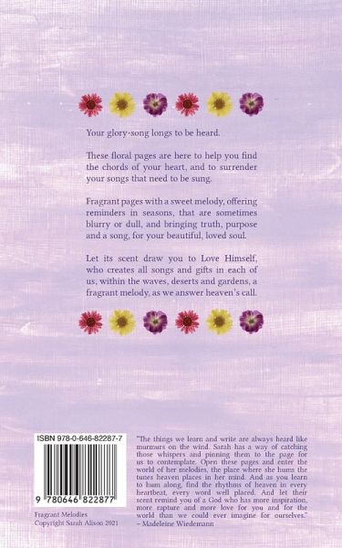 Your glory-song longs to be heard. These floral pages are here to help you find the chords of your heart, and to surrender your songs that need to be sung. Fragrant pages with a sweet melody, offering reminders in seasons, that are sometimes blurry or dull, and bringing truth, purpose and a song, for your beautiful, loved soul. Let its scent draw you to Love Himself, who creates all songs and gifts in each of us, within the waves, deserts and gardens, a fragrant melody, as we answer heaven's call. "The things we learn and write are always heard like murmurs on the wind. Sarah has a way of catching those whispers and pinning them to the page for us to contemplate. Open these pages and enter the world of her melodies, the place where she hums the tunes heaven places in her mind. And as you learn to hum along, find the rhythms of heaven in every heartbeat, every word well placed. And let their scent remind you of a God who has more inspiration, more rapture and more love for you and for the world than we could ever imagine for ourselves." - Madeleine Wiedemann