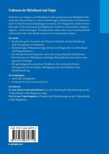 Frakturen von Fingern und Mittelhand stellen gemeinsam die häufigsten Frakturen dar. Klinisch kann es neben Schwellungen, Hämatomen und Schmerzen auch zu Funktionseinschränkungen kommen. Die Diagnostik umfasst neben klinischer Untersuchung auch bildgebende Verfahren, insbesondere röntgenologische Untersuchungen. Therapeutisch sollte neben dem Funktionserhalt insbesondere der individuelle Anspruch im Vordergrund stehen.