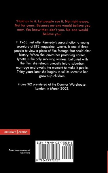 A fascinating dramatisation of a conspiracy theory surrounding Kennedy's assassination It's the 1990s, and Lynette, an ex-assistant editor at LIFE magazine, now living in obscurity, has gathered her family around her to celebrate her birthday. She has a secret that she needs to confide in them. In the 1960s, when she worked as an assistant on LIFE magazine, she was an 'unwilling' witness to the first showing of the (in)famous 'Zapruder' film about the assassination of Kennedy, which allegedly proved the theory that there was a second assassin. Chosen by her boss to hand over the film to the FBI, Lynette is the last surviving link in this particular chain of mysterious events. Thirty years later and the controversy still rumbles on: Will the retiring ex-Assistant forsake her and her family's anonymity for the sake of demonstrating this incontrovertible evidence to the world? Frame 312 is published to tie in with the Donmar Warehouse production in March 2002.