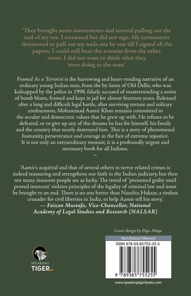 'Framed As a Terrorist' is the harrowing and heart-rending narrative of an ordinary young Indian man, from the by-lanes of Old Delhi, who was kidnapped by the police, falsely accused of being a terrorist, framed and kept in jail for almost fourteen years. Released after a long and incredibly difficult legal battle, after surviving torture and solitary confinement, Mohammad Aamir Khan remains committed to the secular and democratic values that he grew up with. He refuses to be defeated, or to give up any of the dreams he has for himself, his family and the country that nearly destroyed him.
