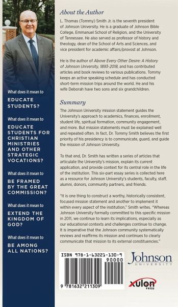 The Johnson University mission statement guides the University's approach to academics, finances, enrollment, student life, spiritual formation, community engagement, and more. But mission statements must be explained well and repeated often. In fact, Dr. Tommy Smith believes the first priority of his presidency is to communicate, guard, and guide the mission of Johnson University. To that end, Dr. Smith has written a series of articles that articulate the University's mission, explain its current application, and provide context for its central role in the life of the institution. This six-part essay series is collected here as a resource for Johnson University's students, faculty, staff, alumni, donors, community partners, and friends. "It is one thing to construct a worthy, historically consistent, focused mission statement and another to implement it within every aspect of the institution," Smith writes. "Whereas Johnson University formally committed to this specific mission in 2011, we continue to learn its implications, especially as our educational contexts and challenges continue to change. It is imperative that the Johnson community systematically reviews and reaffirms its mission and continues to clearly communicate that mission to its external constituencies." Sidebar: What does it mean to educate students? What does it mean to educate students for Christian ministries and other strategic vocations? What does it mean to be framed by the Great Commission? What does it mean to extend the kingdom of God? What does it mean to be among all nations? L. Thomas (Tommy) Smith Jr. is the seventh president of Johnson University. He is a graduate of Johnson Bible College, Emmanuel School of Religion, and the University of Tennessee. He also served as professor of history and theology, dean of the School of Arts and Sciences, and vice president for academic affairs/provost at Johnson. He is the author of Above Every Other Desire: A History of Johnson University, 1893-2018, and has contributed articles and book reviews to various publications. Tommy keeps an active speaking schedule and has conducted short-term mission trips around the world. He and his wife Deborah have two sons and six grandchildren.