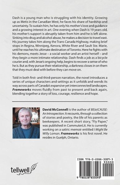 Dash is a young man who is struggling with his identity. Growing up as Metis in the Canadian West, he faces his share of hardship and uncertainty. To sustain him, he has only his mother's love and guidance and a growing interest in art. One evening when Dash is 19 years old, his mother's support is abruptly taken from him and he is left alone. Sinking into drug and alcohol abuse, he makes a decision to travel east. His journey takes him along the Trans Canada Highway, making brief stops in Regina, Winnipeg, Kenora, White River and Sioux Ste. Marie, until he reaches his ultimate destination of Toronto. Here he fights with his demons, meets Jesse - a social worker and an artist herself - and they begin a more intimate relationship. Dash finds a job as a bicycle courier and, with Jesse's ongoing help, begins to recover a sense of who he is. But as they pursue their relationship, a darkness closes in on them that they must deal with before they can move on. Told in both first and third person narration, the novel introduces a series of unique characters and settings as it unfolds and wends its way across parts of Canada's expansive yet interconnected landscapes. Frameworks moves fluidly from past to present and back again, blending together a story of loss, courage, resilience and hope.