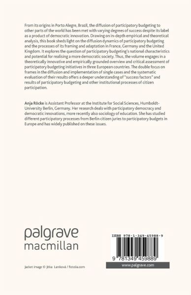 INTRODUCTION PART I: ANALYTIC FRAMEWORK: FRAMES, DIFFUSION AND DEMOCRATIC INNOVATIONS 1. Frames and Diffusion 2. Citizen Partixcipation and Democratic Innovations 3. A Democratic Innovation: PB in Porto Alegre PART II: THE INVENTION OF NATIONAL MODELS? PB IN FRANCE, GERMANY AND THE UNITED KINGDOM 4. France: With PB Beyond "Proximity"? 5. Germany: PB Between Consultation, Financial Squeeze and the "Citizens Town' 6. United Kingdom: PB as a Form of Community Empowerment? PART III: FROM FRAMES TO DEMOCRATIC INNOVATIONS? THREE LOCAL CASE STUDIES OF PARTICIPATORY BUDGETING 7. Participatory Democracy in Schools? The Case of Poitou-Charentes, France 8. Participatory Budgeting as Citizens' Town? The Case of Berlin Lichtenberg, Germany 9. Salford, England (United Kingdom): Participatory Budgeting as a Form of Top-Down Community Empowerment Conclusion