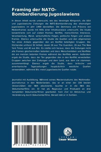 In dieser Arbeit wurde untersucht, wie das Vereinigte Königreich, die USA und jugoslawische Zeitungen die NATO-Bombardierung des ehemaligen Jugoslawiens im Jahr 1999 darstellten. Die Dominanz und Präsenz von Medienframes wurde mit Hilfe einer Inhaltsanalyse untersucht. Die Studie konzentrierte sich auf sieben Frames: Konflikt, menschliches Interesse, Verantwortung, Moral, wirtschaftliche Folgen, politische Folgen und andere Frames. Ebenso untersuchte die Studie die Quellen und den allgemeinen Ton eines Artikels gegenüber den am Konflikt beteiligten Gruppen. Die Stichprobe umfasst 92 Artikel, davon 26 aus The Guardian, 26 aus The New York Times und 40 aus Blic. Es stellte sich heraus, dass die Zeitungen nicht alle Frames gleichermaßen betonten und dass Menschenleben und Konflikte die am meisten betonten Frames während des Konflikts waren. Außerdem ergab die Studie, dass der Ton gegenüber den in den Konflikt verwickelten Gruppen zwischen den Zeitungen und dem Land, aus dem sie stammen, zusammenhängt. Ebenso ergab die Studie, dass britische und amerikanische Tageszeitungen hauptsächlich westliche Quellen verwendeten, während Blic meist jugoslawische Quellen nutzte.