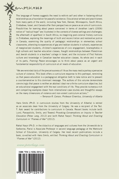 The language of frames suggests the need to rethink self and other in fostering ethical relationships as a foundation for peaceful existence. Educational writers and practitioners from many parts of the world, including New York, Denver, Minneapolis, South Africa, Zimbabwe, Israel, and Canada offer their perspectives on peace as an aim of curriculum. Possibilities for learning about peace conceived in terms of Jonathan Lear's (2006) notion of «radical hope» are illustrated in the contexts of diverse settings and challenges: the aftermath of apartheid in South Africa, re-imagining post-colonial history curricula in Zimbabwe, exploring the meanings of truth and reconciliation and restorative justice in Canada, examining the quality of pedagogic relationships in elementary school classrooms, attending to experiences of gay and lesbian students in schools, experiences of marginalized students, children's experiences of civic engagement, Islamophobia in high schools and teacher education classes, fraught relationships between Palestinian and Jewish students in a teachers' college in Israel, and the inclusion of First Nations culture and knowledge in Canadian teacher education classes. As whole and in each of its parts, Framing Peace encourages us to think about peace as an urgent and fundamental responsibility of curriculum at all levels of education.