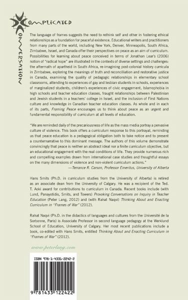 The language of frames suggests the need to rethink self and other in fostering ethical relationships as a foundation for peaceful existence. Educational writers and practitioners from many parts of the world, including New York, Denver, Minneapolis, South Africa, Zimbabwe, Israel, and Canada offer their perspectives on peace as an aim of curriculum. Possibilities for learning about peace conceived in terms of Jonathan Lear's (2006) notion of «radical hope» are illustrated in the contexts of diverse settings and challenges: the aftermath of apartheid in South Africa, re-imagining post-colonial history curricula in Zimbabwe, exploring the meanings of truth and reconciliation and restorative justice in Canada, examining the quality of pedagogic relationships in elementary school classrooms, attending to experiences of gay and lesbian students in schools, experiences of marginalized students, children's experiences of civic engagement, Islamophobia in high schools and teacher education classes, fraught relationships between Palestinian and Jewish students in a teachers' college in Israel, and the inclusion of First Nations culture and knowledge in Canadian teacher education classes. As whole and in each of its parts, Framing Peace encourages us to think about peace as an urgent and fundamental responsibility of curriculum at all levels of education.