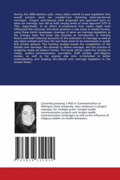 During the 2004 election cycle, many states rushed to pass legislation that would prevent same sex couples from obtaining state-sanctioned marriages. Oregon and Georgia both proposed and approved bans on same sex marriage, but did so with varying levels of voter approval (57% & 75%, respectively). In an effort to understand how media might have influenced this outcome, this book presents a case study in media framing, using those states' newspaper coverage of same sex marriage legislation as the primary texts. The book also includes an introduction to framing theory and brief historical accounts of the institution of marriage as well as gay rights activism and how the two have come to be intertwined in public and private spheres. The framing analysis reveals the complexities of the debate over marriage, the attempt to define marriage, and the practice of analyzing media via distinct frames. This book will be useful for scholars in media, politics, communication, journalism, GLBT studies, and religious studies, as well as for anyone else who is interested in better understanding and shaping the debate over marriage legislation in the United States.